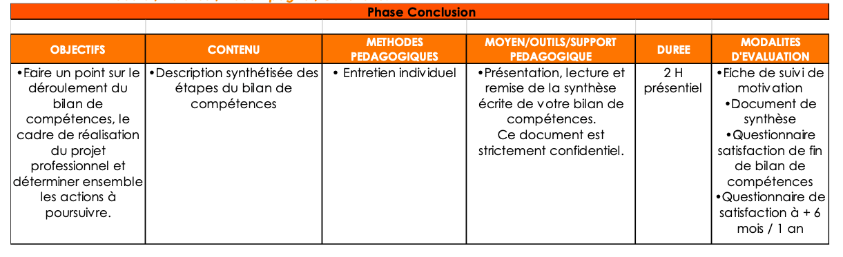 - 3° Une phase de conclusions qui, par la voie d'entretien personnalisé, permet au bénéficiaire (2H)