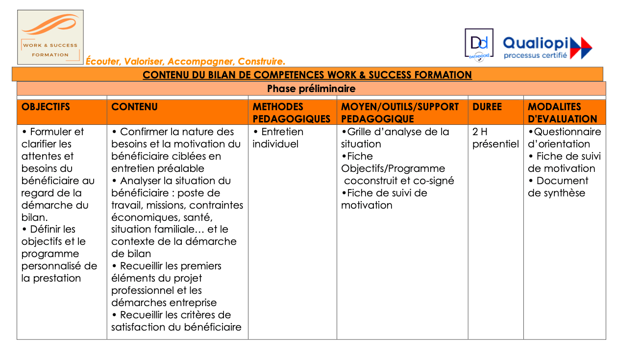 CONTENU DU BILAN DE COMPETENCES WORK & SUCCESS FORMATION